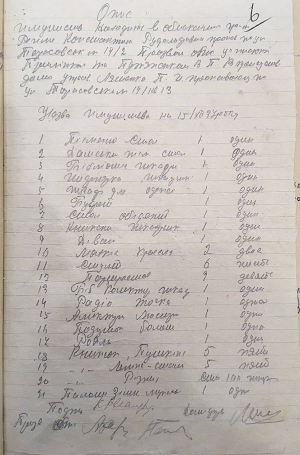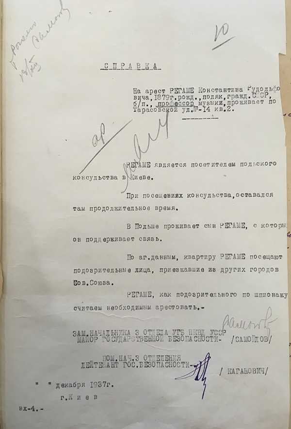 Podejrzenie w NKWD szybko osiąga poziom oskarżenia i 14 grudnia 1937 następuje aresztowanie. Regame zostaje wyzbyty praw i osobistego mienia – dokument trzeci. Protokół zawiera 21 pozycji, jakże prostych a w życiu ważnych: fortepian, stół, lampa, książki, zimowe palto, jakże nas dzisiaj wzruszających. I tych ośmiu agentów, funkcjonariuszy policyjnych, którzy potwierdzili podpisami swój udział w tym obrachunku, który był najprostszym rabunkiem, oczywiście na rzecz i ku chwale komunistycznego sojuza. I ten sąsiad, zapewne trzęsący się ze strachu, wezwany z kamienicy świadek, bo po niego przecież mogą też przyjść któregoś dnia.