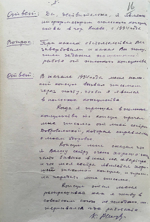 Najpierw tylko wezwany, przesłuchiwany, bardzo szybko – już podejrzany, z nakazem aresztowania - o czym informuje dokument pierwszy (z byłego Archiwum NKWD w Kijowie). Któż mógłby wiedzieć jaki Ojciec był wtedy samotny, jak bardzo tęsknił za synem w Warszawie, który w Jego mniemaniu miał zostać wielkim muzykiem. Tylko te listy, świadectwo wielkich wewnętrznych zmagań, były dla Niego pociechą i wielką nadzieją. Tak, przychodził do poselstwa odebrać kolejny list. Niczego nie krył i powiedział to wprost, to, co zostało zapisane z przesłuchania w protokole – dokument drugi. Swoje pisane do syna listy piękną polszczyzną w odpowiedzi numerował, żeby się nie zagubiły i sens ich nie stracił znaczenia.