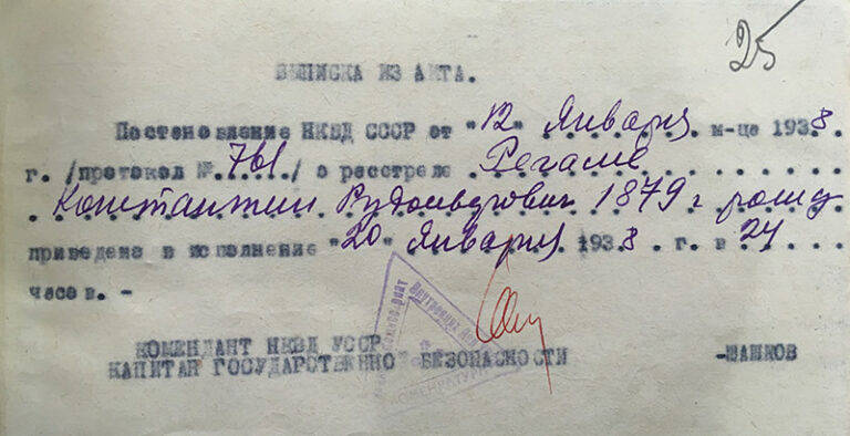 Po latach niepewności, trwogi, czy to, co dowiedzieliśmy się dwadzieścia lat temu jest prawdziwe. Czy rzeczywiście śmierć Kostii Regame była aż tak straszna? Po dwudziestu latach już wiemy wszystko, mamy przed sobą dokumenty, jakie w archiwach pozostawiło NKWD, sowiecka policja śledcza. Widzimy, że z podejrzenia, o tym że Kostia uczęszczał do polskiego poselstwa, zrodziło się sowieckie oskarżenie o szpiegostwo. On pianista, profesor Konserwatorium Kijowskiego, Konstanty Rudolfowicz Regame – szpiegiem. Tylko to był czas, kiedy każdy bardzo łatwo mógł nim się stać.